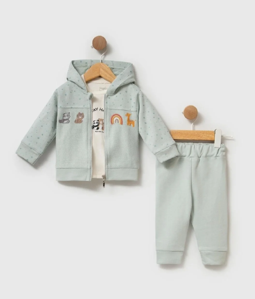 %100 pamuklu bu set; üzerinde panda, zürafa ve gökkuşağı nakışları bulunan fermuarlı bir hırka, grafik baskılı bir iç body ve uyumlu pantolondan oluşur. Yumuşacık pamuklu dokusu ve rahat kalıbı sayesinde bebeğinizin oyun saatlerinde ve günlük aktivitelerinde özgürce hareket etmesini sağlar.