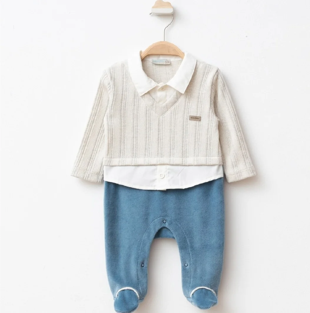 Bebeğiniz için centilmen şıklığı ve konfor bir arada! Üst kısmı kendinden gömlek ve süveter detaylı, alt kısmı ise yumuşacık patikli tulum tasarımıyla özel günler ve günlük kullanım için idealdir.