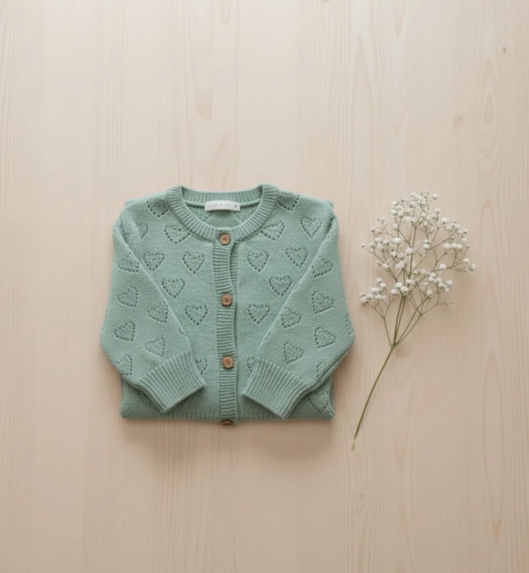 Yumuşacık örgü dokusu ve zarif kalp nakışlarıyla tasarlanan bu hırka, bebeğinizi sıcak tutarken şık bir görünüm sunar. Önden düğmeli yapısı sayesinde kolayca giydirilebilir ve her türlü kombinle mükemmel uyum sağlar.