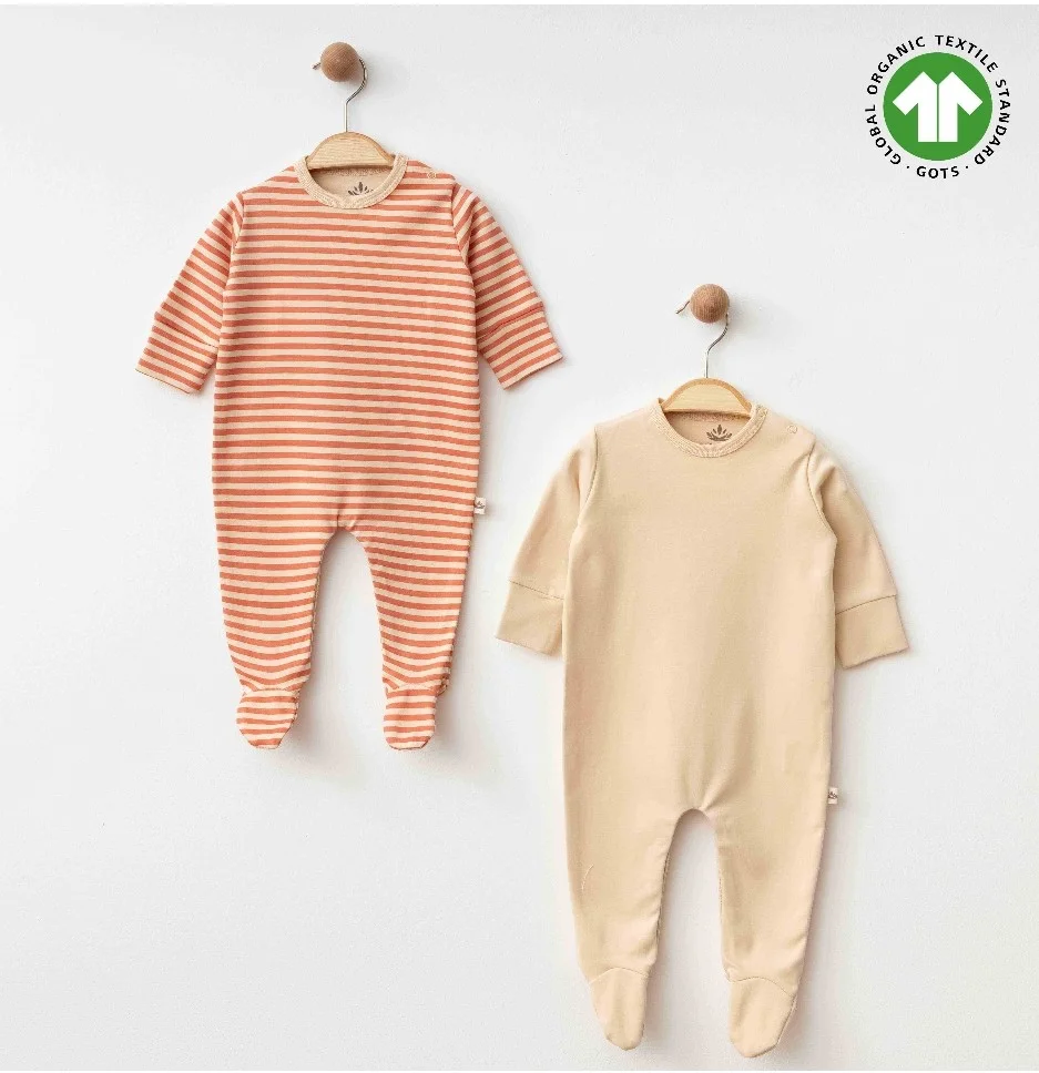 Krem Kiremit Çizligi 2'li Organik Pamuklu Tulum